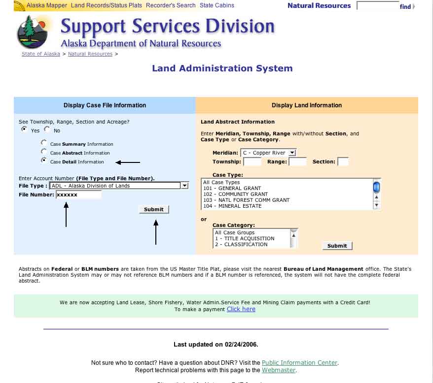 We see several mining claims (MCL).  Consider MCL xxxxxx, this the same as ADL xxxxxx and from the Land Records page we click on natural resources. Then we click on Case File and Land Abstracts. We may also get here by selecting "Land Records - Case Files" directly from my home page.  Either method leads us to: