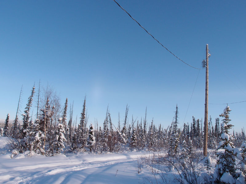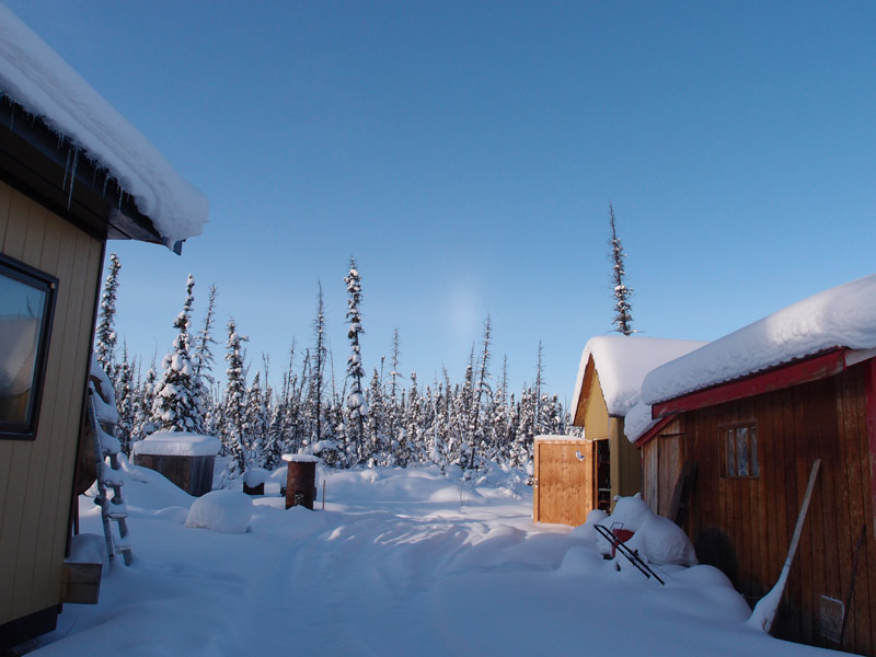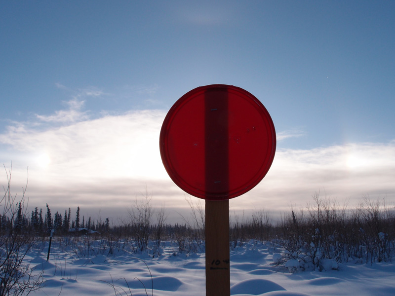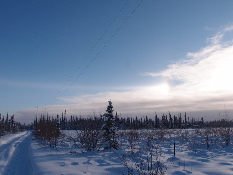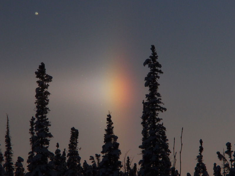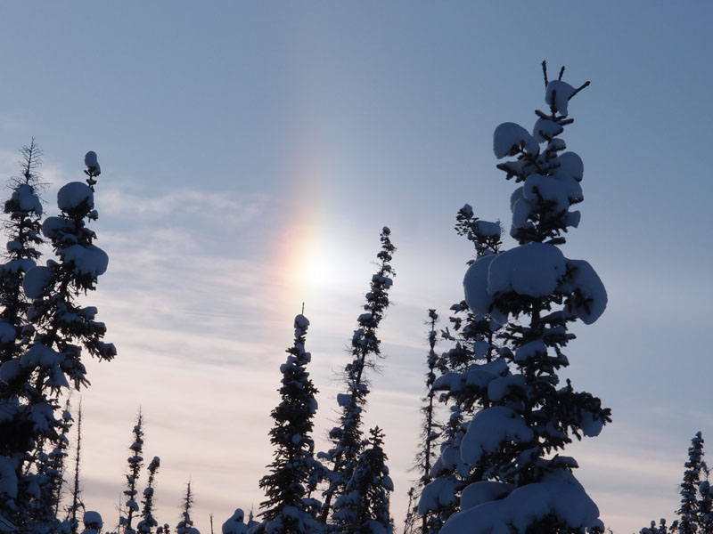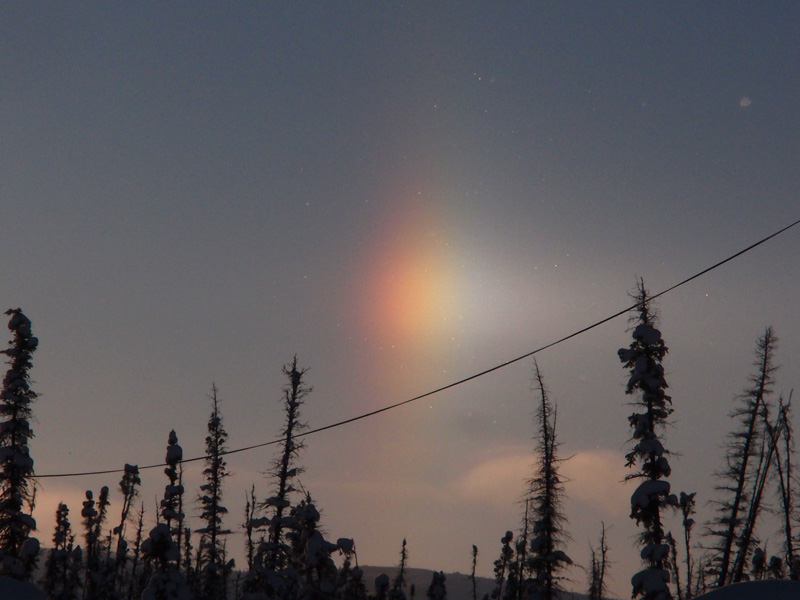 In the town of Central, 100 air miles northeast of Fairbanks Alaska, we had sun dogs caused by ice crystals in the atmosphere. Both reflection and refraction were involved with refraction producing colored effects and reflection producing white effects. On Tuesday February 19th the reflection effects were minimal and the sun dogs were highly colored while on Wednesday February 20th the reflection effects dominated and overwhelmed the most of the colored effects.